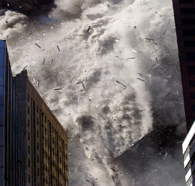 10:28 a.m.: The World Trade Center's north tower collapses from the top down as if it were being peeled apart, releasing a tremendous cloud of debris and smoke.